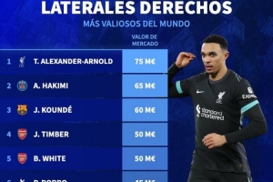 开云平台-皇马又免签了个硬菜?德转列右后卫身价:阿诺德7500万欧居首